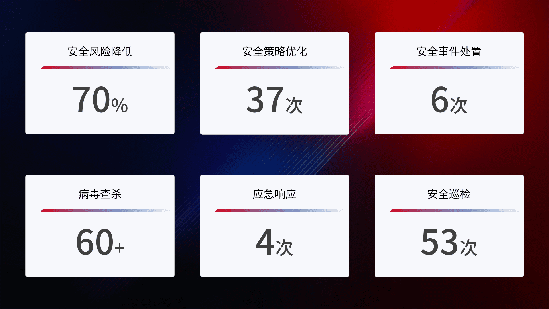 提供全面的安全事件报告体系,,,包括处置报告、、、、周报、、、、季度和年度总结,,,,结合持续监控,,帮助客户深入了解网络安全状况。。。。