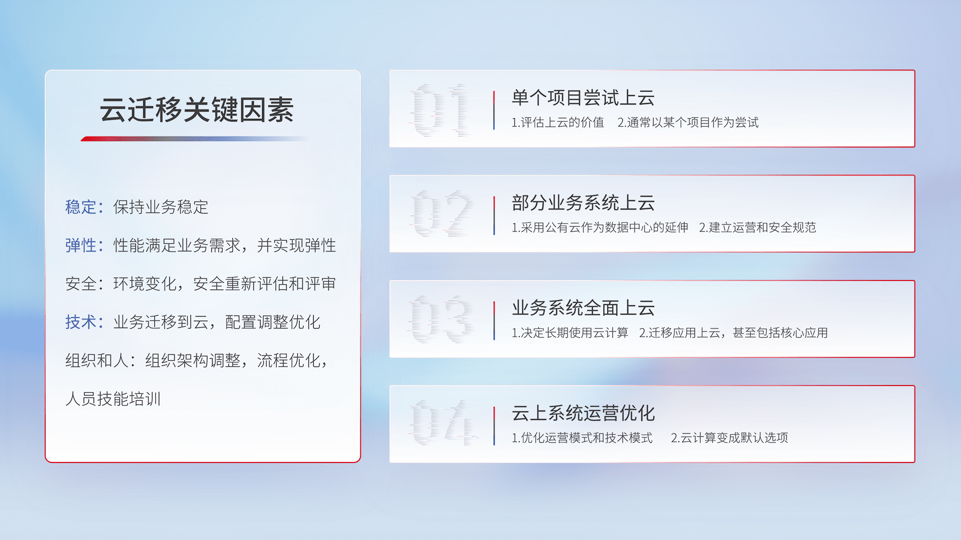 结合实际业务,,,,从规划设计、、云平台选型、、、、云原生改造、、、数据迁移、、、集成交付,,迁移全过程为客户识别最佳上云路径,,做好风险识别管理,,设计网络架构、、、身份权限、、、、安全审计合规、、、、操作审计、、、、日志审计、、、、监控告警策略、、、多站点容灾设计等,,对云上基础设施进行整体规划,,提升IT治理水平,,,,以满足弹性、、高可用、、、高性能的需求。。。