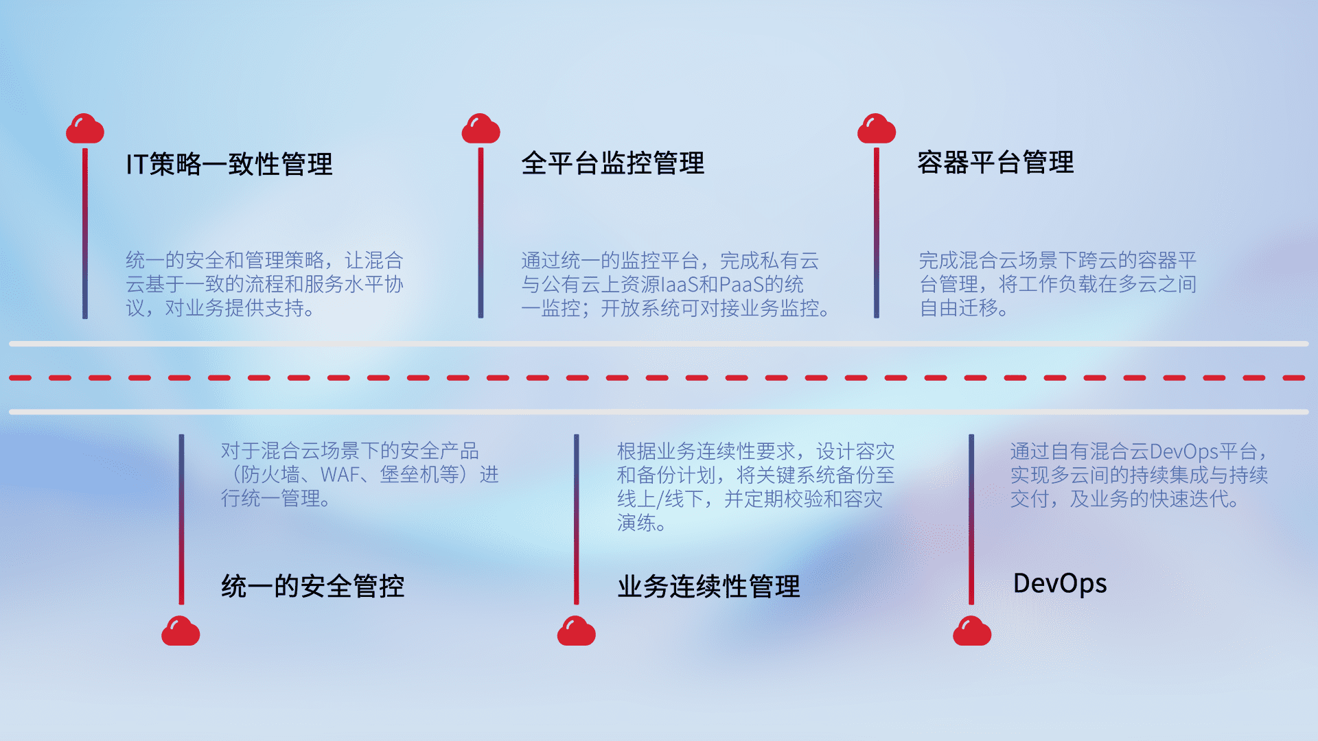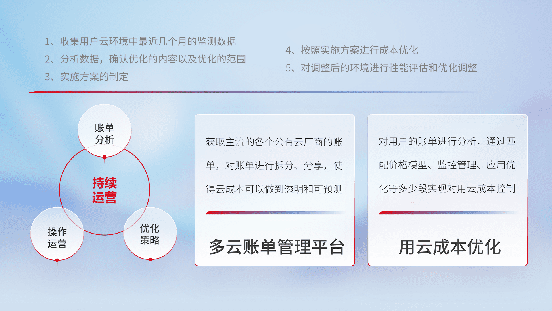 通过多云纳管,,,,以统一的资源数据模型把客户的云资源进行抽象和封装,,进而实现对多云资源的统一操作,,,,保障云资源管理的可靠性、、、稳定性与可用性。。。量身定制化运维内容,,,,配置、、、、开发运维、、补丁管理、、、、备份、、、、监控、、、认证和访问管理、、、审计和日常巡检等,,保障在用云过程中的可靠度,,,稳定度以及高可用率。。。。