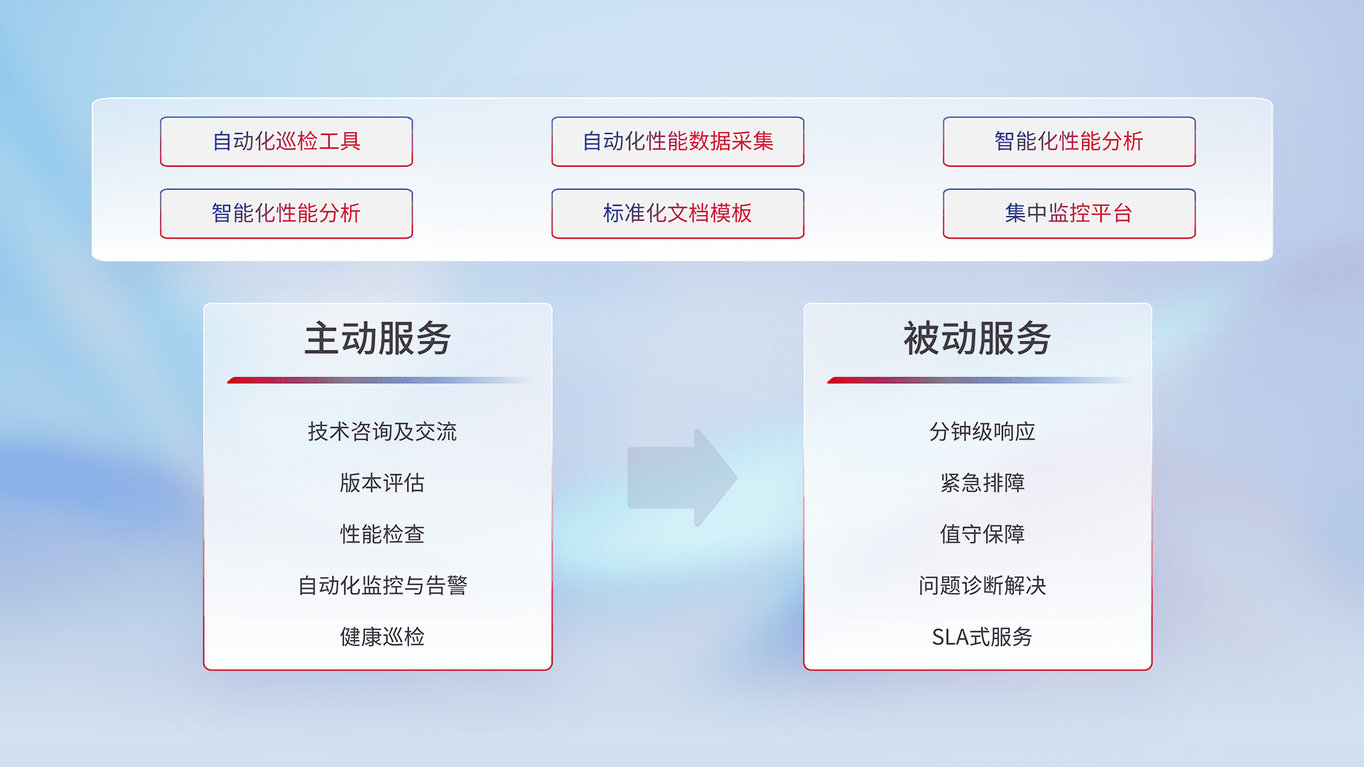 智能化工具和标准化文档,,,,保障服务质量,,,,提供主动服务(包含技术咨询、、版本评估、、、性能检查、、、自动化监控与告警、、、、健康巡检)和被动服务包含(分钟级响应、、、紧急排障、、值守保障、、、、问题诊断解决、、SLA服务)。。。。
